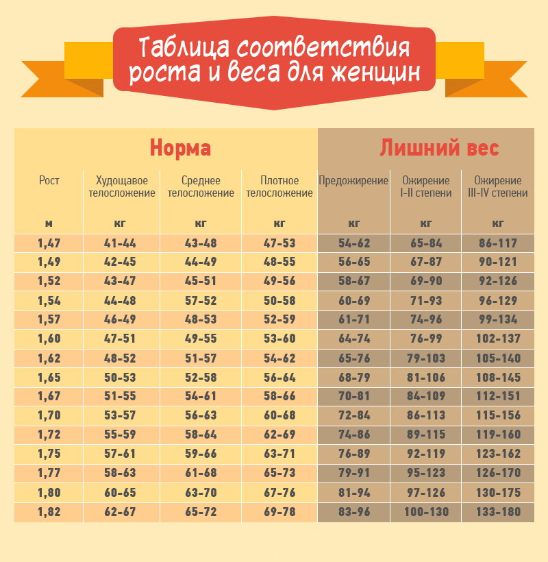 Если вес человека больше, чем указанный для роста, человек подвержен риску ожирения, сердечно-сосудистых заболеваний, диабета, желчнокаменной болезни, остеопороза и бесплодия (1).