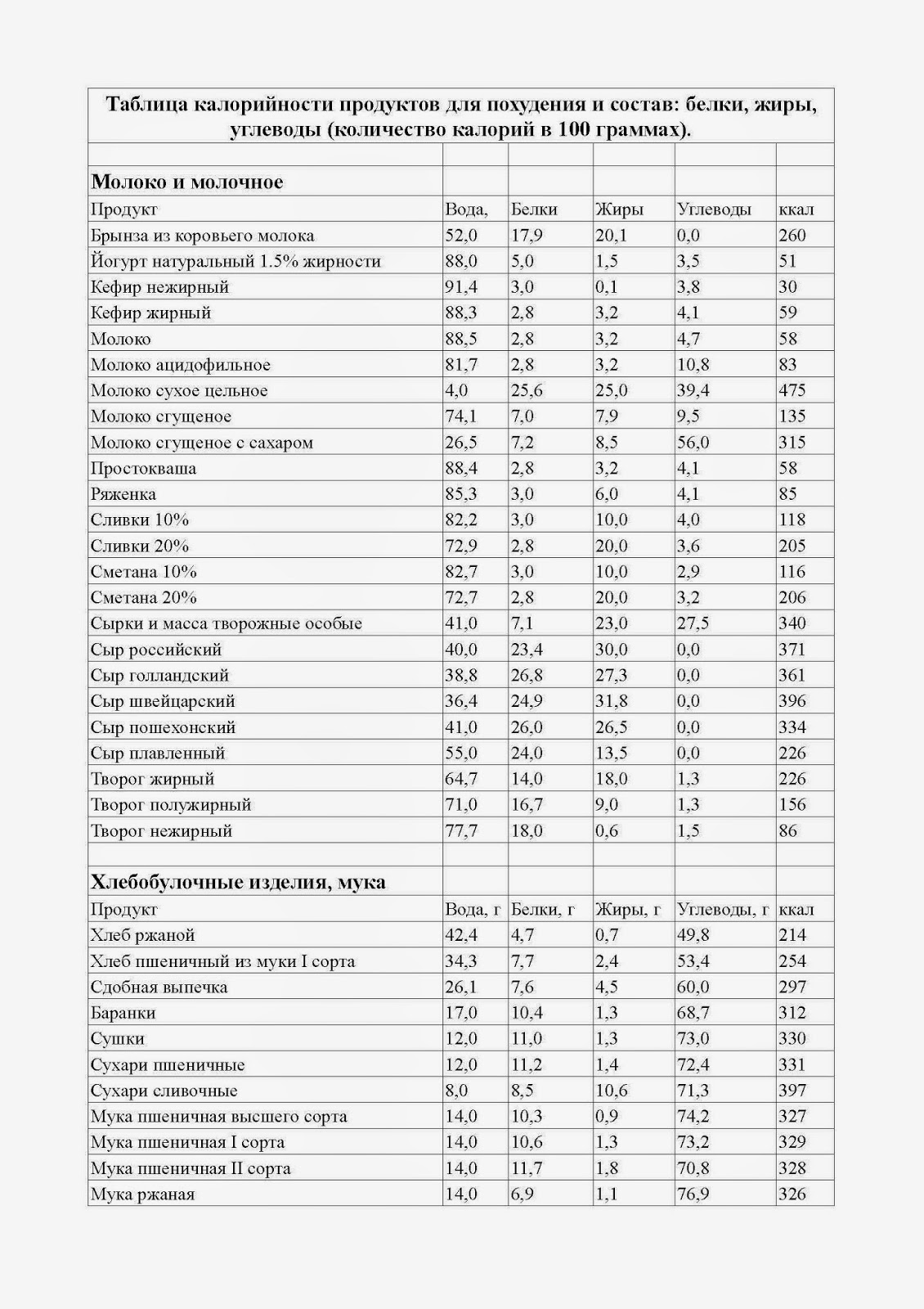 Таблица калорийности всех продуктов питания (можете скачать бесплатно и распечатать)